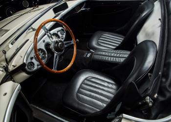 An examination of the simple and nicely trimmed interior showcases the quality and care in this 100M's restoration. Despite that the restoration is several years old, the door jams are still tidy, the doors themselves open and close without issue, and all electrical components are fully operable. The black leather bucket seats are well kept, having developed some light fading in the finish around the bolsters. The leather trimmed door panels also show some dulling in the finish but lack the more serious marks of use (scuffs, pulls, tears). Glancing down at the rugs, they have clearly seen no mistreatment, presenting well. The painted dash is clean, housing the rebuilt and refinished Smiths instruments. All in all, the cabin has matured nicely, now possessing a welcomed light patina. Overall everything appears correct, in order, and showing as nicely restored.